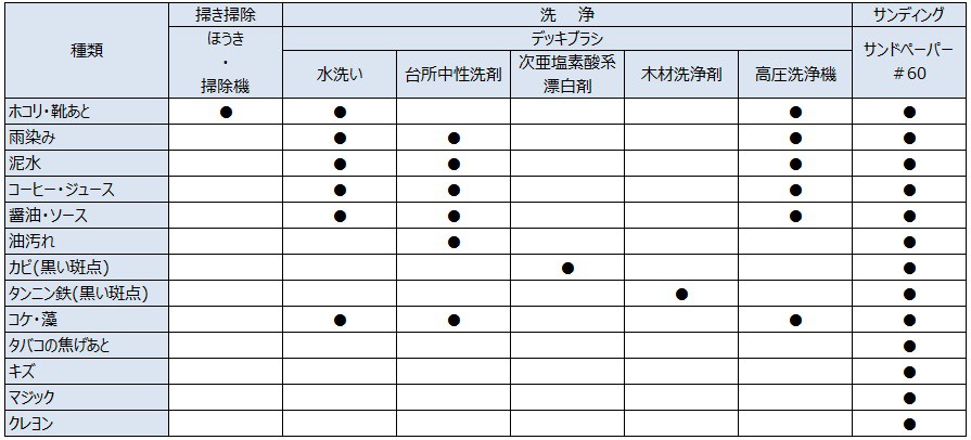 リウッドデッキのメンテナンスの方法は、汚れ方に応じて以下の方法があります。