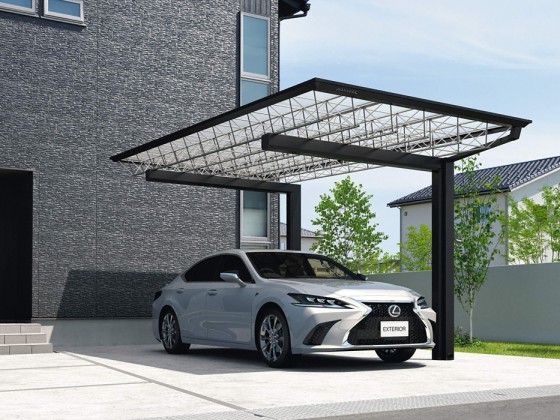 軽量で優れた強度のトラス構造を取り入れたM.シェードII。アルミ製の後付けカーポートのイメージを覆す、高級感と存在感のあるフォルムが印象的です。敷地や車の台数などに合わせてタイプやサイズも選べます。【イエソト広報・中尾】