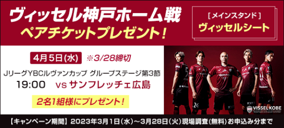 2023年3月1日(水)〜3月28日(火)のキャンペーン期間中に無料現場調査・商品のみの見積もり依頼をお申込みいただいたお客様から、ご成約に関わらず、お見積りご提示で、下記のヴィッセル神戸の試合観戦チケットを、抽選で2名1組様にプレゼントいたします。
