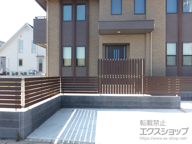 木調色のフェンスが印象的。ぬくもりの感じられる外構です。