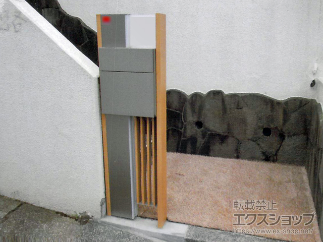 階段横の設置という少し特殊な設置場所ですが、外壁のデザインと商品のシンプルな作りが自然な仕上がりになっております。