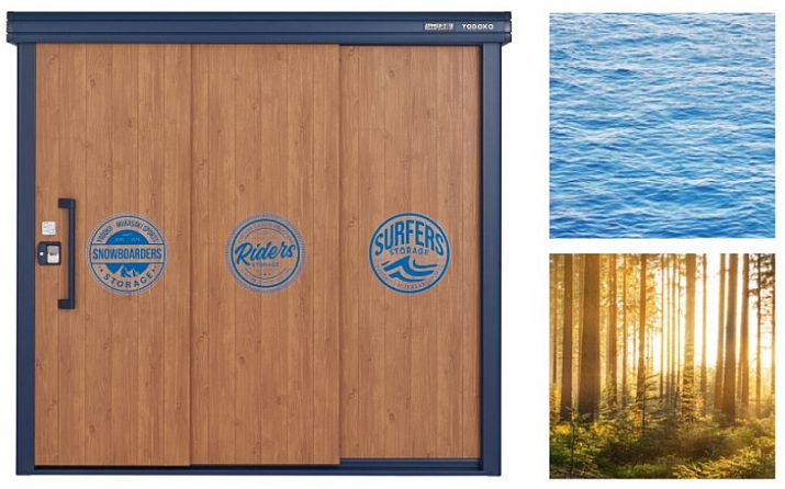 新商品【ヨド物置エルモ KOTO OKI by ムラサキスポーツ】のカラーは、本体は海をイメージした色の深いブルー、扉は森の木々をイメージしたナチュラルウッドを採用しております。また、扉用のロゴステッカーが付いてくるので、お好みで取り付けることができます!
