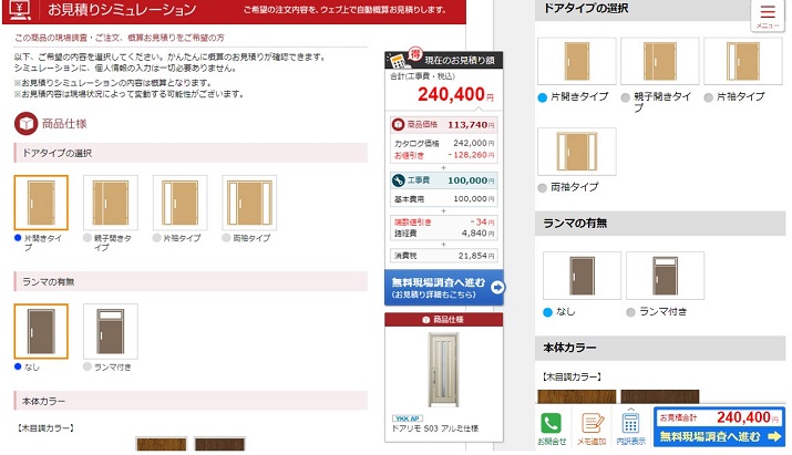 まずは画像のように、玄関ドアの商品ページの「お見積りシュミレーション」と書かれている赤いボタンをクリックします。画像の左側がパソコンの画面、右側がスマートフォンの画面で、使っている端末で操作方法が異なります。