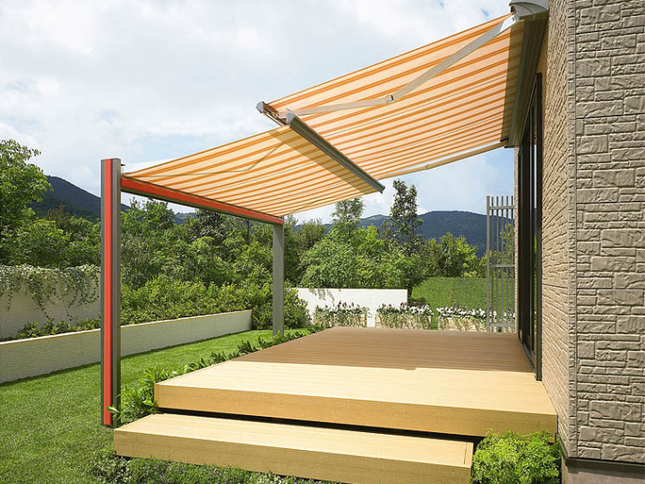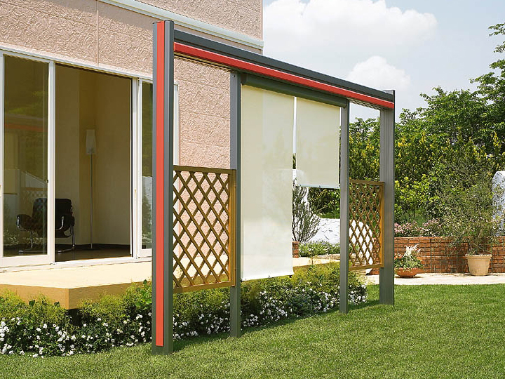 独立タイプで取付け場所は選ばない新発想オーニング!突然の雨にもリモコン操作ですぐ対応。ナチュラルなデザインはたくさんの緑や花に囲まれたお庭にぴったりです!