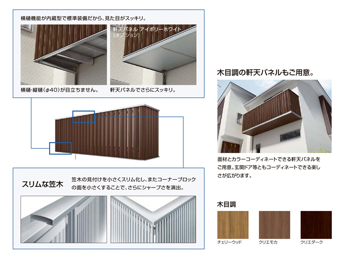 ビューステージSスタイル 柱建て式 横化粧格子 単体は2本の柱を用いるバルコニーです。出幅方向と間口方向への雨水処理ができるSスタイルは排水口の改良によって掃除が簡単に。また、横樋・前桁の一体化でデザイン性もアップ。豊富な面材・床材が揃っています。