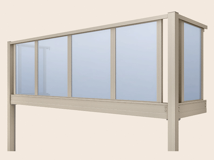 やわらかく太陽光を迎え入れる透明のブルースモークパネルです。 2本柱で支え、スリット床を使い下の空間にも光が入り有効活用できます。 安心感を与える90mmの強靭な柱が支えるバルコニーです。