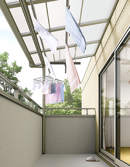 端部垂木をしっかり抑え込む垂木掛けの改良、前枠と端部垂木の幅寸法の拡大など、屋根材が飛びにくい機構のパワーアルファに、積雪50cmまで対応できるタイプが登場です!F型のフラットでシンプルな屋根が、ベランダにスッキリしたイメージを与えます。急な積雪にも安心なパワーアルファを、ぜひご検討ください!