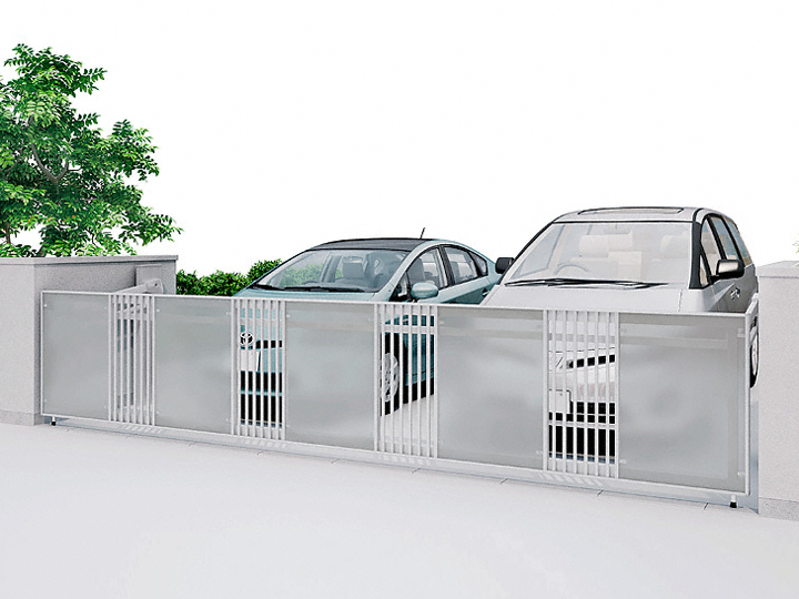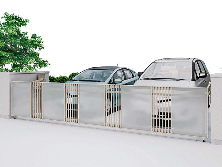 ポリカーボネートの面材をつかった目隠しデザインの撥ね上げ式ゲート。カーポートがある場合は扉を上げた時に当たるかもしれないので現場見積時にチェックします。運転席からリモコン操作で雨の日も真夏の炎天下にも出ず開閉ができる優れものです。