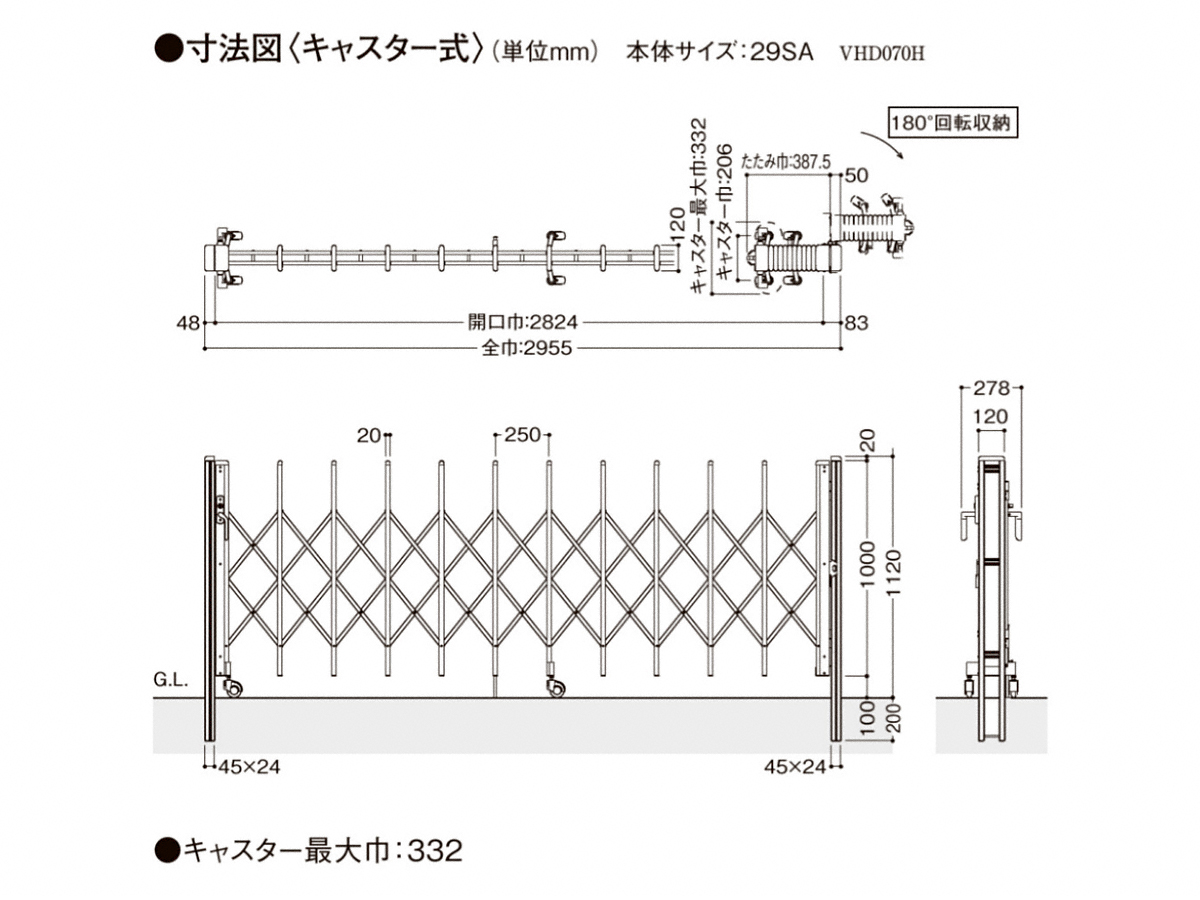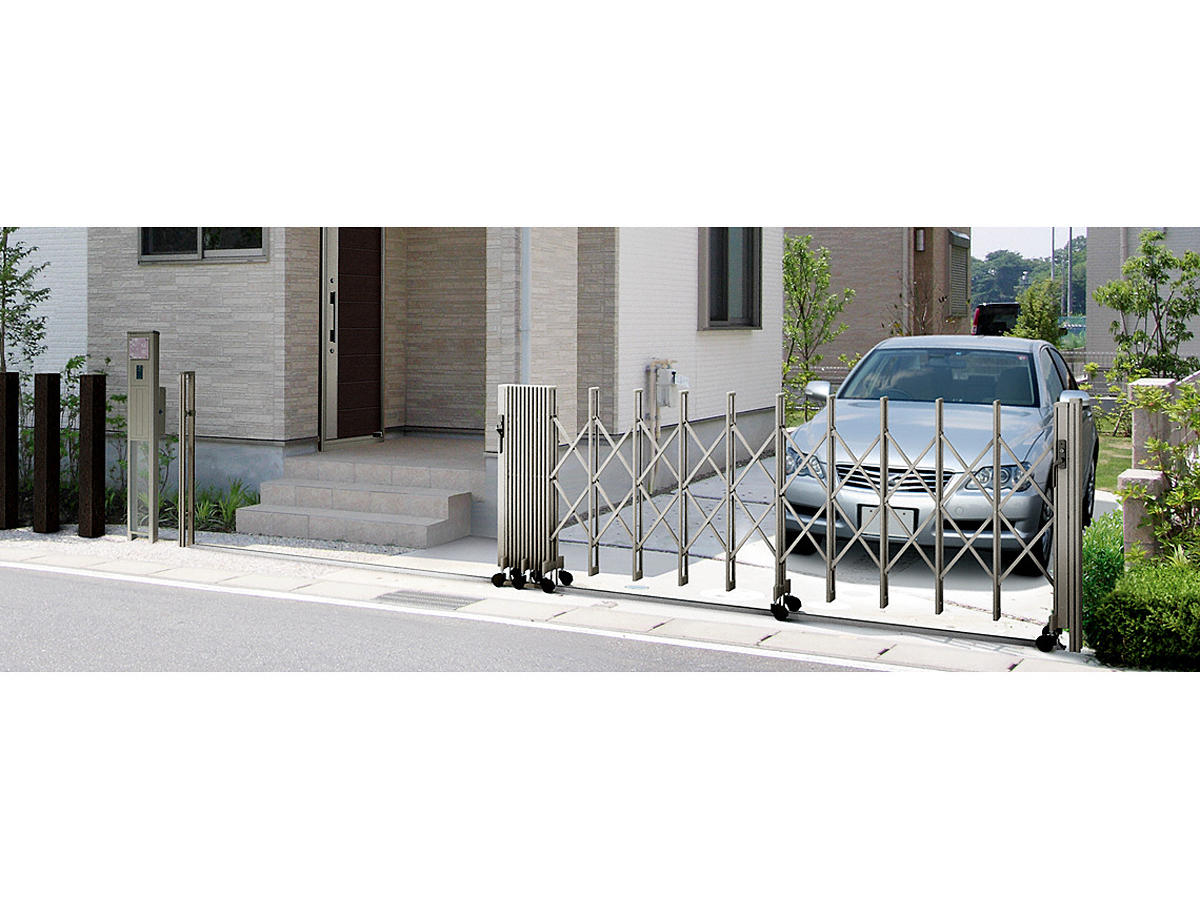 カーゲート セレビューMA型 両開きは垂直パンタ仕様のカーゲートです。柱先端に自走防止の落し錠はかがむことなく操作できます。また、吊り元部分には操作性が高まるヒンジと回転止めが標準装備されています。カラーバリエーションはブラック・シャイングレー・オータムブラウン・ホワイト。