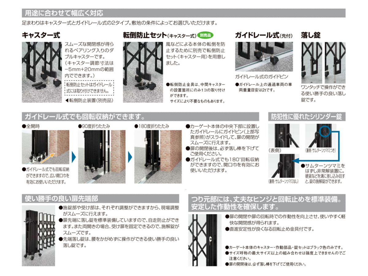 カーゲート セレビューMA型 両開き親子は垂直パンタ仕様のカーゲートです。柱先端に自走防止の落し錠はかがむことなく操作できます。また、吊り元部分には操作性が高まるヒンジと回転止めが標準装備されています。カラーバリエーションはブラック・シャイングレー・オータムブラウン・ホワイト。