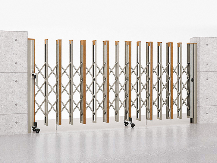 H型は桟と桟の間のクロスしている格子が3つ入っている伸縮ゲートです。桟と桟の間隔は、185mm。扉は両方に開き、扉は180度回転させて収納ができるので限られた開口スペースを有効利用できます。