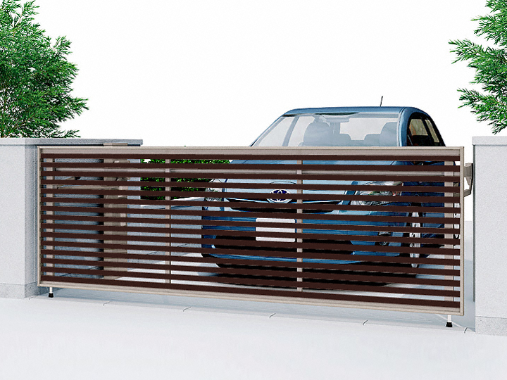 太い横格子デザインの撥ね上げ式ゲート。正面部分が木目で温かなカースペースを演出します。扉の厚みはわずか52mm。直昇タイプで敷地ギリギリに設置が可能、駐車場の奥行きをギリギリまで有効活用できます。カーポートがある場合は扉を上げた時に当たるかもしれないので現場見積時にチェックします。