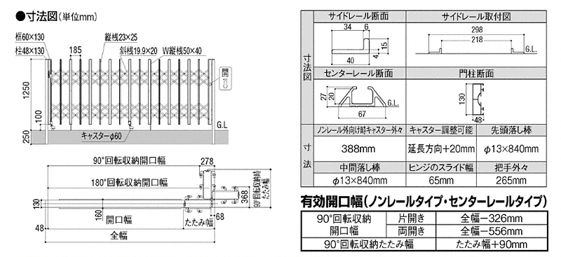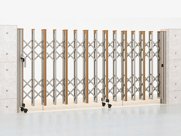 HW型は桟と桟の間のクロスしている格子が上下に分かれ、2本に1本の割合で太い縦枠が入る伸縮ゲートです。桟と桟の間隔は、185mm。間口の小さい子扉と大きい親扉の比率は規格幅以外にも敷地状況・使用状況に応じてカスタマイズが可能です。Cタイプは木目調の桟になります。