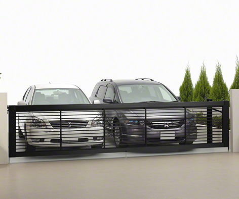 ラクに開閉できる省スペース設計の撥ね上げしき門扉。既存のカーポートの柱位置や有効高に注意が必要です。
