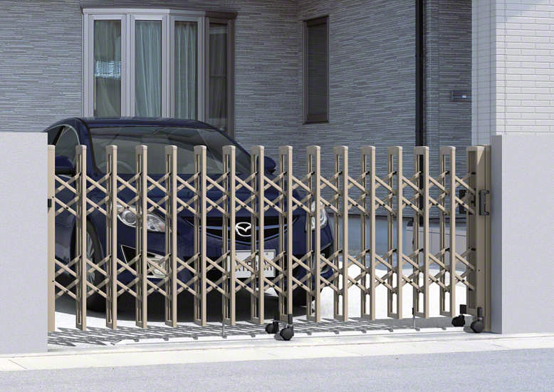 跳ね上げ式のカーゲートが勝手に下がってしまうようになり、今回はアコーディオンタイプにした。開け閉めしやすく、特に雨の時にかさをさしたままでも簡単に開け閉めできるところがよい。