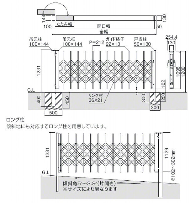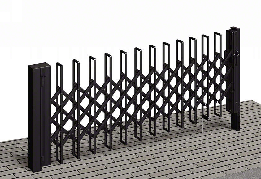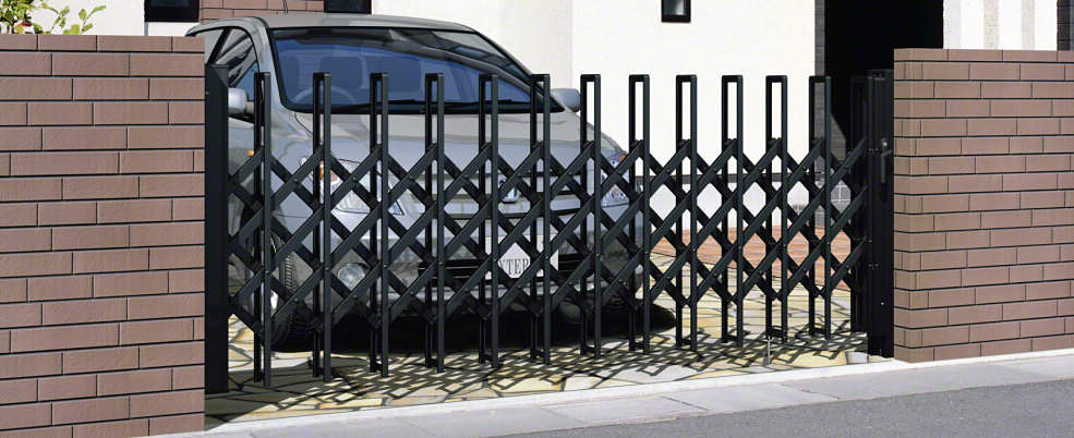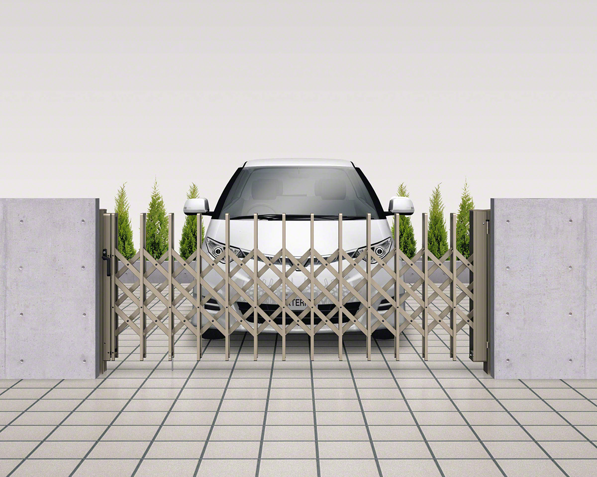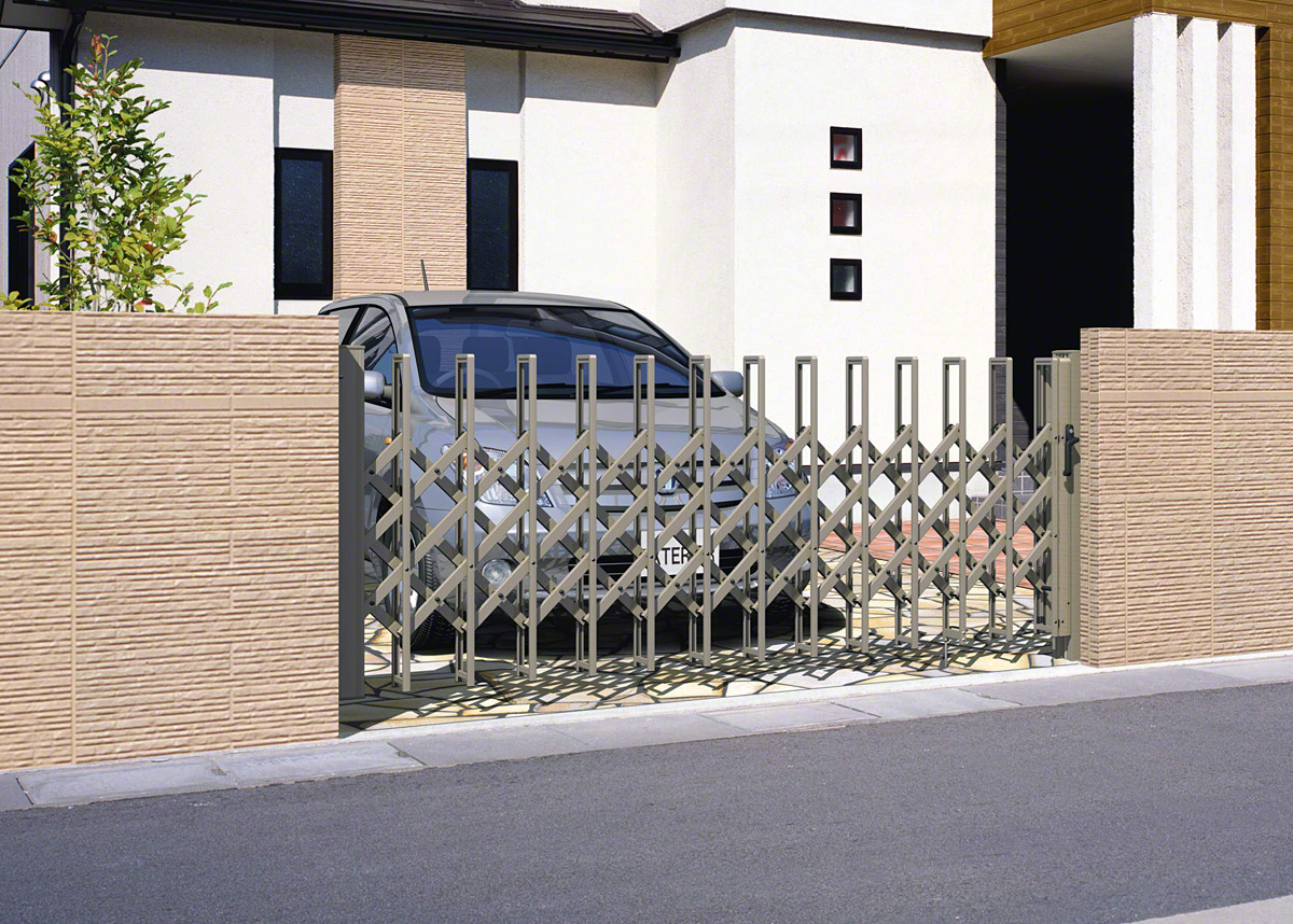 キャスターやレールが無い伸縮型のカーゲートです。地面の仕上げを気にする必要がなく、凹凸がある床面でも軽々と操作できます。開口幅は最大で2,870mmまでで、傾斜地でも対応可能です。