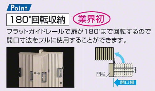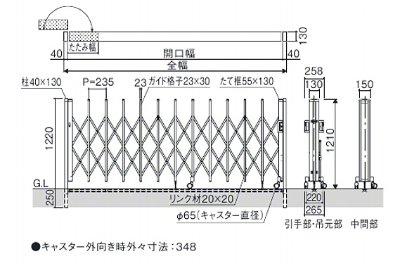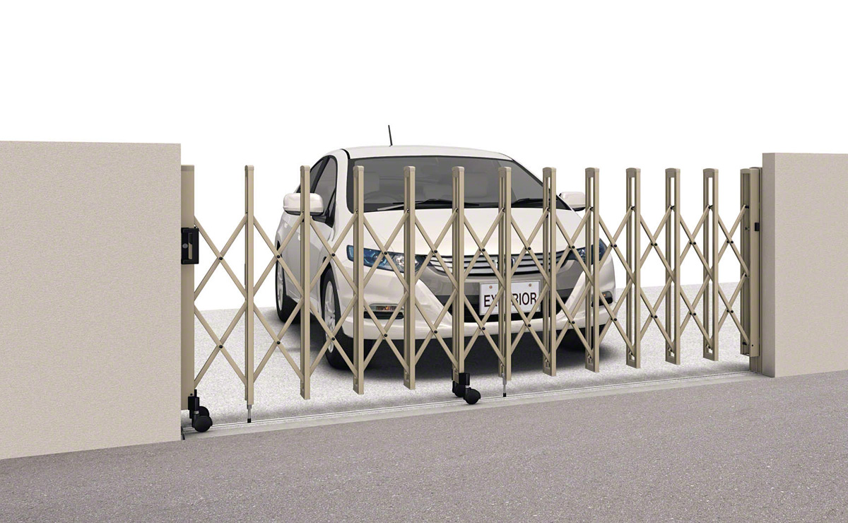 2つのキャスターと振れ止め機構が、開閉時の安定性を実現したエクモアGSの両開きタイプ。フラットなガイドレールは、人や車が通る時に邪魔にならないだけではなく、安定性もアップします。伸縮扉の縦格子の間隔が広めの235mmで、解放感を損なわない両開きタイプのカーゲートです。
