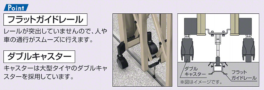 フラットなガイドレールは、人や車が通る時に邪魔にならないだけではなく、安定性もアップします。色は4種類ご用意しております。