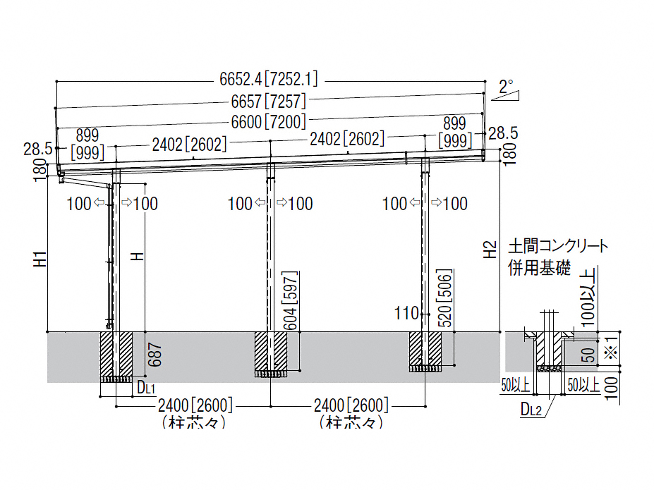 屋根高タイプ | 標準柱仕様(有効高 約2,300mm) / ロング柱25仕様(有効高 約2,500mm) / ロング柱30仕様(有効高 約3,000mm) |