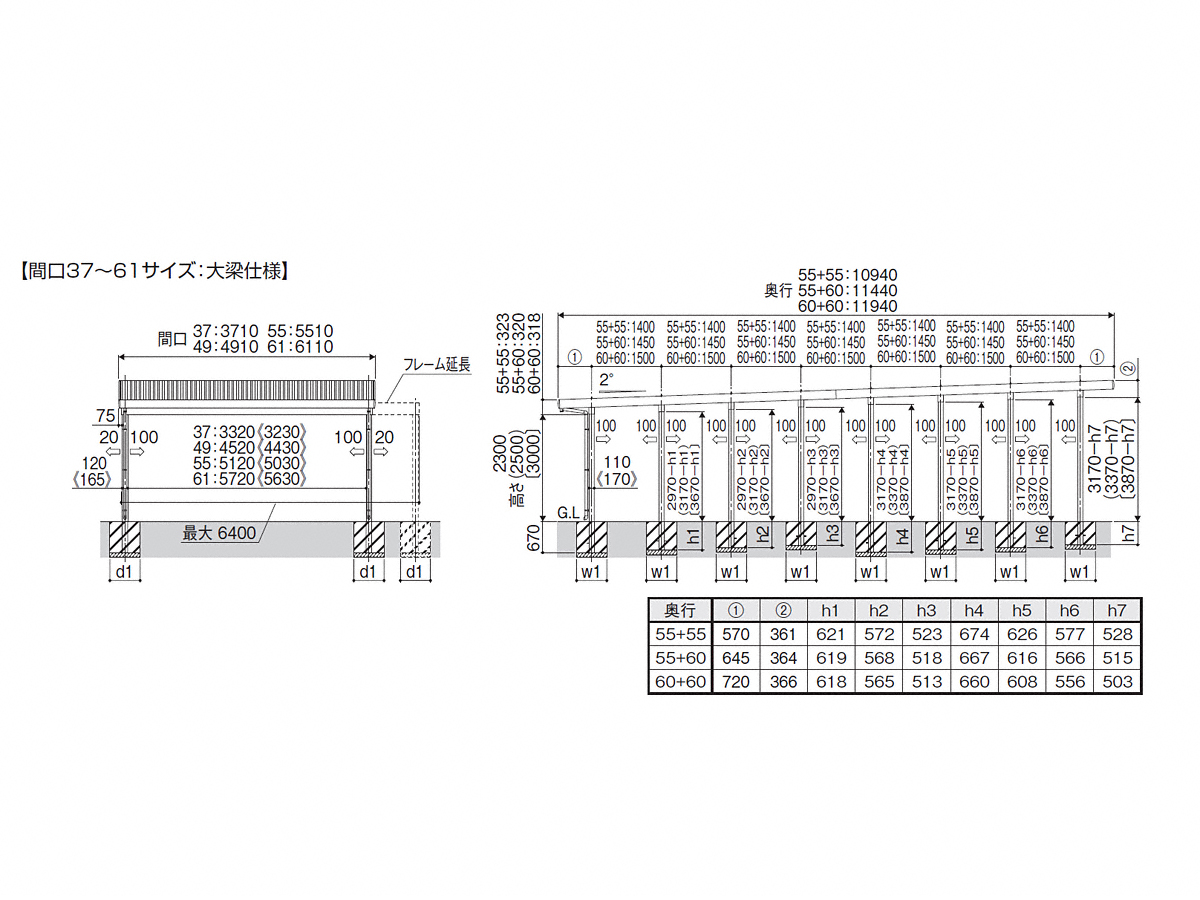 | 屋根高タイプ | 標準柱仕様 (有効高 約2,300mm) / ロング柱仕様 (有効高 約2,500mm) / ハイロング柱仕様 (有効高 約3,000mm) |