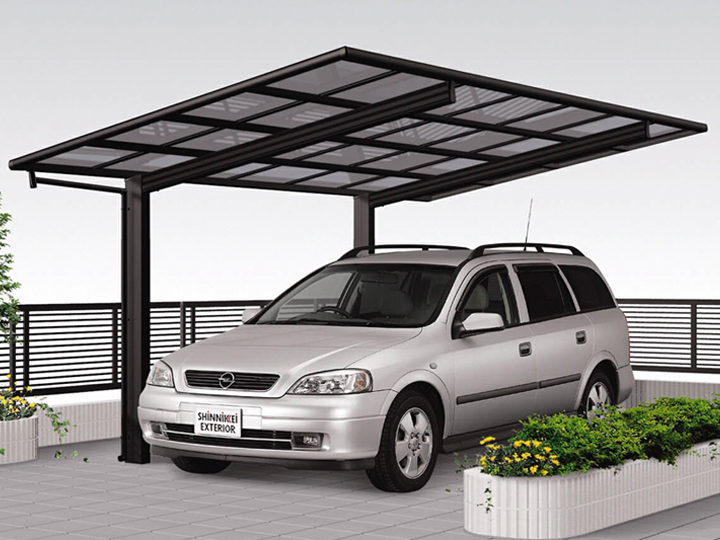 フラット屋根の片流れカーポートです。必要な性能やバリエーションをしっかり抑えておりオーソドックスながら定番のカーポートです。雨の吹き込みを考慮し敷地と予算が許す限り大きなサイズのカーポートを取りけるのがポイントです。