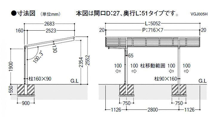 | 屋根高タイプ | 標準柱仕様(有効高 約1,900mm) / 長柱仕様(有効高 約2,350mm) / 長々柱仕様(有効高 約2,800mm) |