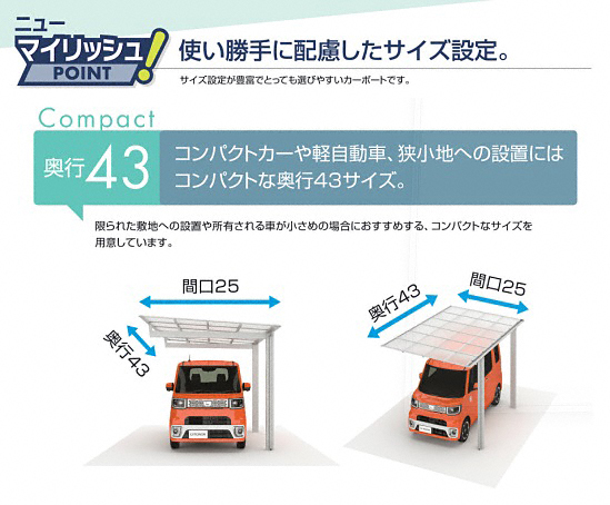 軽快でモダンな印象を放つスタイリッシュカーポート。サイズも豊富にそろえ、門まわりから車庫まわりまでトータルコーディネートできます。限られた敷地への設置や所有される車が小さめの場合におすすめする、コンパクトなサイズを用意しています。