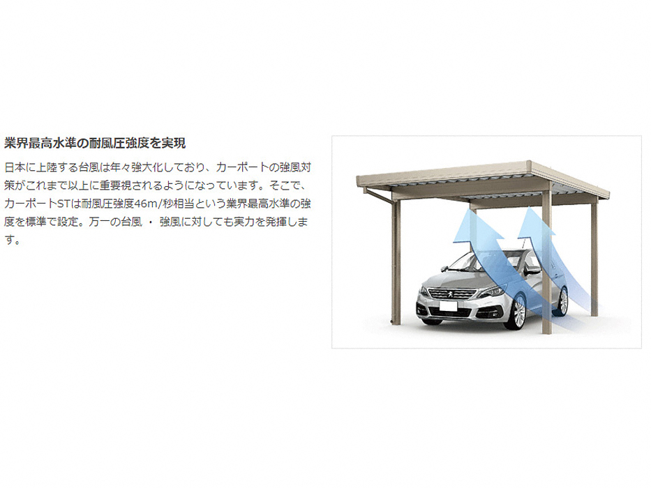 耐風圧・積雪強度に優れた強度の高く、風が強い日でも安心のカーポート。吹き付ける風や雪から愛車を守る心強いカーポート。丈夫なだけではなく、シンプルなフラット屋根形状のデザインは、スタイリッシュで美しいカーポートです。丈夫なだけではなく、お客様の車庫周りをモダンに演出いたします。