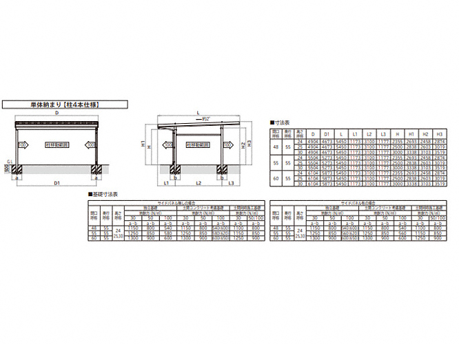 | 屋根高タイプ | 標準柱仕様(有効高 約2,350mm) / セミハイルーフ柱仕様(有効高 約2,500mm) / ハイルーフ柱仕様(有効高 約3,000mm) / 凍上柱仕様(有効高 約2,500mm) |