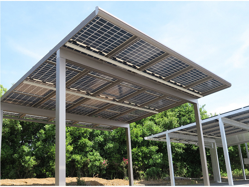 太陽光カーポート E-PORT V 2台用は両面仕様の太陽光パネルにより駐車中の車内にほのかな光が入って明るくなります。エクスショップでは「駐車+自家発電の一石二鳥なカーポートを設置したい!」という方に太陽光カーポート E-PORT V 2台用をおすすめします。