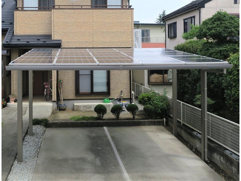 太陽光カーポート E-PORT V 2台用は太陽光発電が可能なカーポートです。50cm以下の耐積雪性能があり、耐風圧性能も38m/sまでカバーしています。太陽光パネルは両面受光タイプのため、直射日光だけでなく地面からの反射光でも発電します。