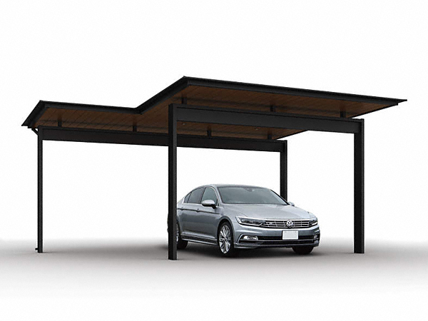 エクスティアラルーフ 積雪30cmタイプ 入隅セット アプローチ+1台用 ダウンライト付き 複合色はアルミ色と木調色を組み合わせた、アプローチと車1台分を覆う大きさの屋根をもつカーポートです。入隅部分は敷地・建物形状に合うようにサイズオーダーいただけます。積雪30cm相当・風速46m/s相当の耐久性があります。