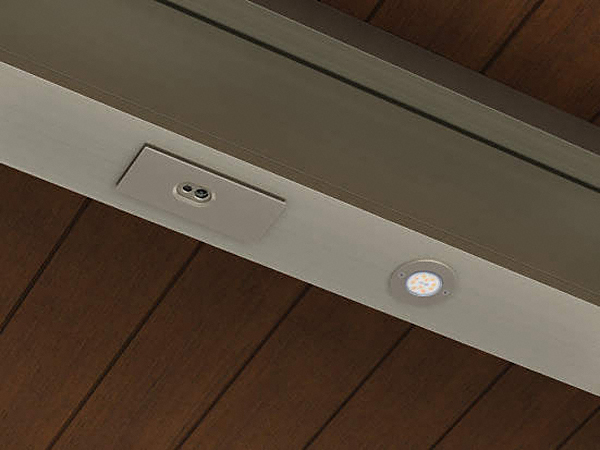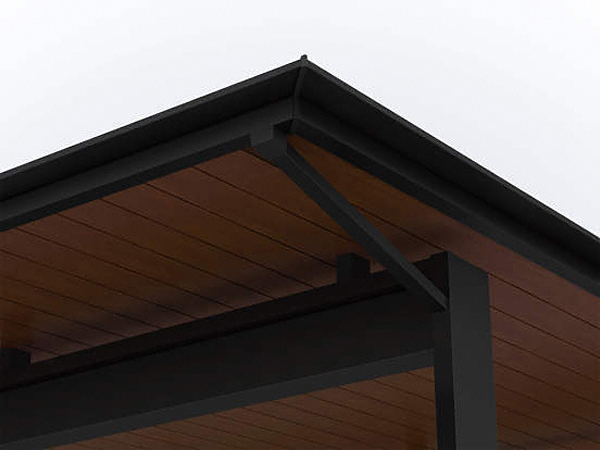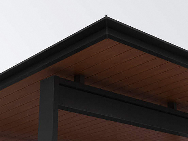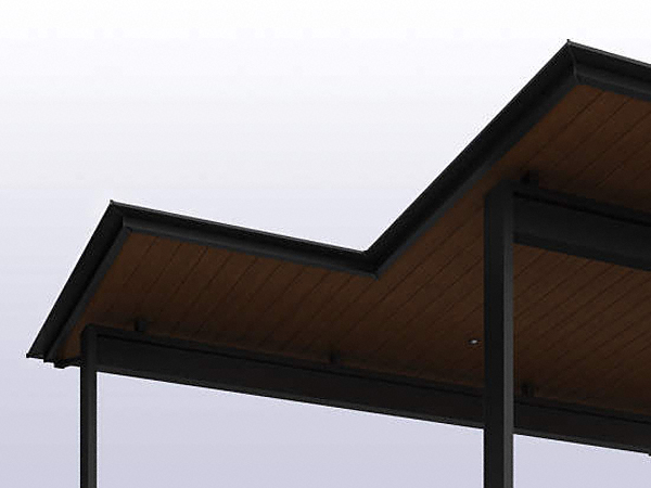 エクスティアラルーフ 積雪30cmタイプ 入隅セット アプローチ+1台用 ダウンライト付き 複合色は軒天パネルの木目調の風合いがアプローチ空間まで広がります。エクスショップでは変形地にも対応するエクスティアラルーフ 積雪30cmタイプ 入隅セット アプローチ+1台用 ダウンライト付き 複合色をおすすめします。