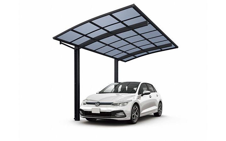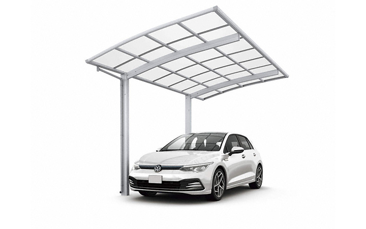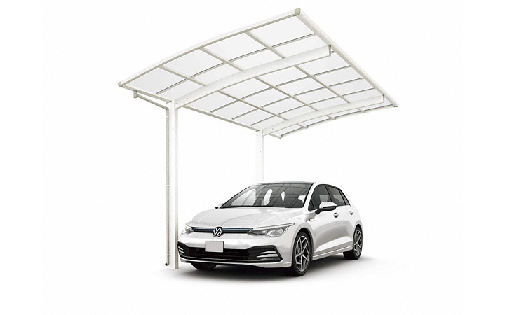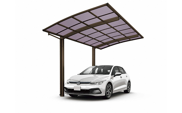 アリュース 600タイプ 1台用はアール屋根・片側支持仕様のカーポートです。柱と梁にはT6処理(部材押出時に水で急速冷凍し高強度化)を施したアルミニウム合金を採用。基準風速Vo=34m/s・耐積雪性能20cmの安心性能です。オプションとしてサイドパネルなどもご用意。
