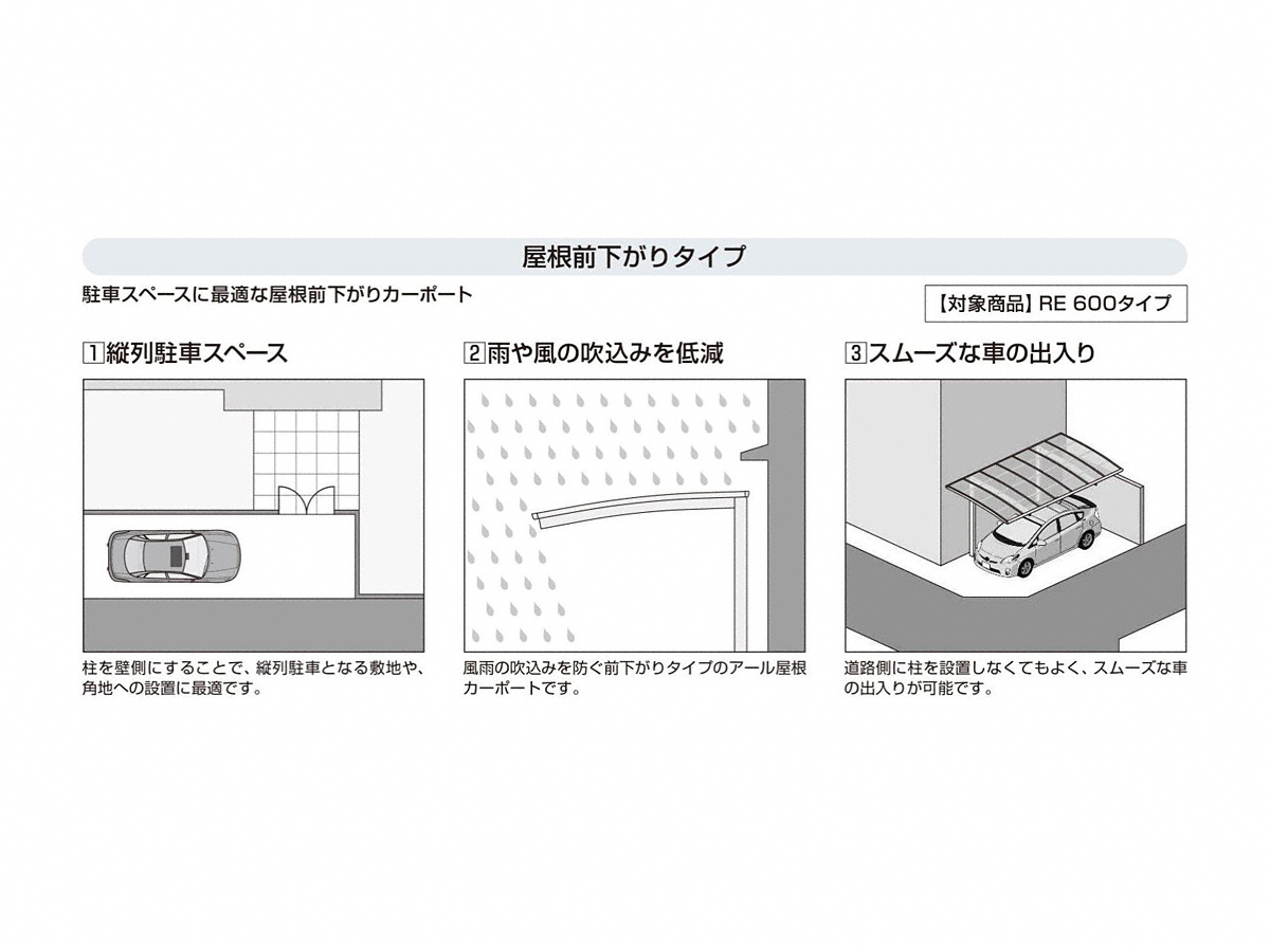 屋根が通常のカーポートとは逆勾配の仕様のため、隣家への雨はねや落雪を防ぎたい方におすすめです。また、前下がりのため、風雨の吹き込みを大幅にカットします。シャープな形状でご自宅の外観にもフィットする機能面・デザイン面ともに高水準のカーポートです。