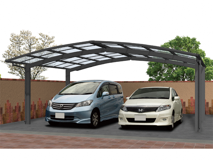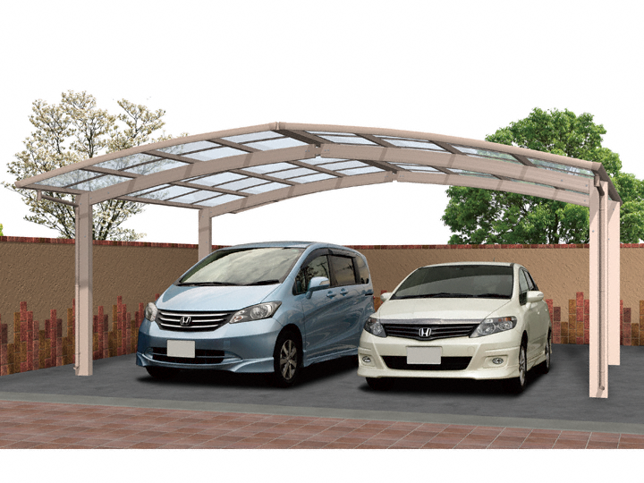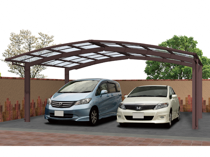 プレシオスポート アール型 M合掌セット 2台用は2つのプレシオスポート アール型 1台用の屋根先を接合した、エクスショップオリジナルブランドのM字型カーポートです。耐風性能は基準風速Vo=34m/s・耐積雪性能は20cm相当(600N/㎡)があります。