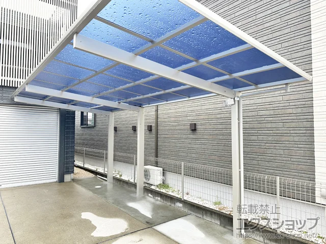 プレシオスポート フラット型 奥行延長セット 1.5台用は縦方向にゆとりのある、エクスショップオリジナルブランドのカーポートです。耐風性能は基準風速Vo=34m/s・耐積雪性能は20cm相当(600N/㎡)あります。本体は3色・屋根材は4色から選択可能です。