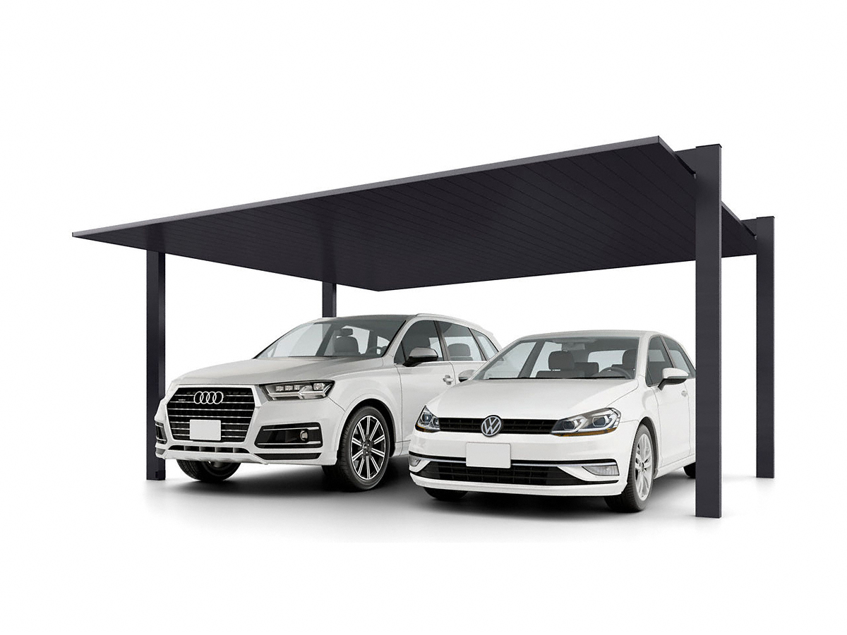 カーポートSC 2台用 縦2連棟 ダスクグレー色はアルミデザインの屋根材が特徴的な最大4台駐車可能なカーポートです。脱ポリカーボネートを謳った珍しいアルミ素材の屋根材で日光を遮断。基準風速Vo=42m/s・耐積雪20cm相当の耐久性能を有しています。
