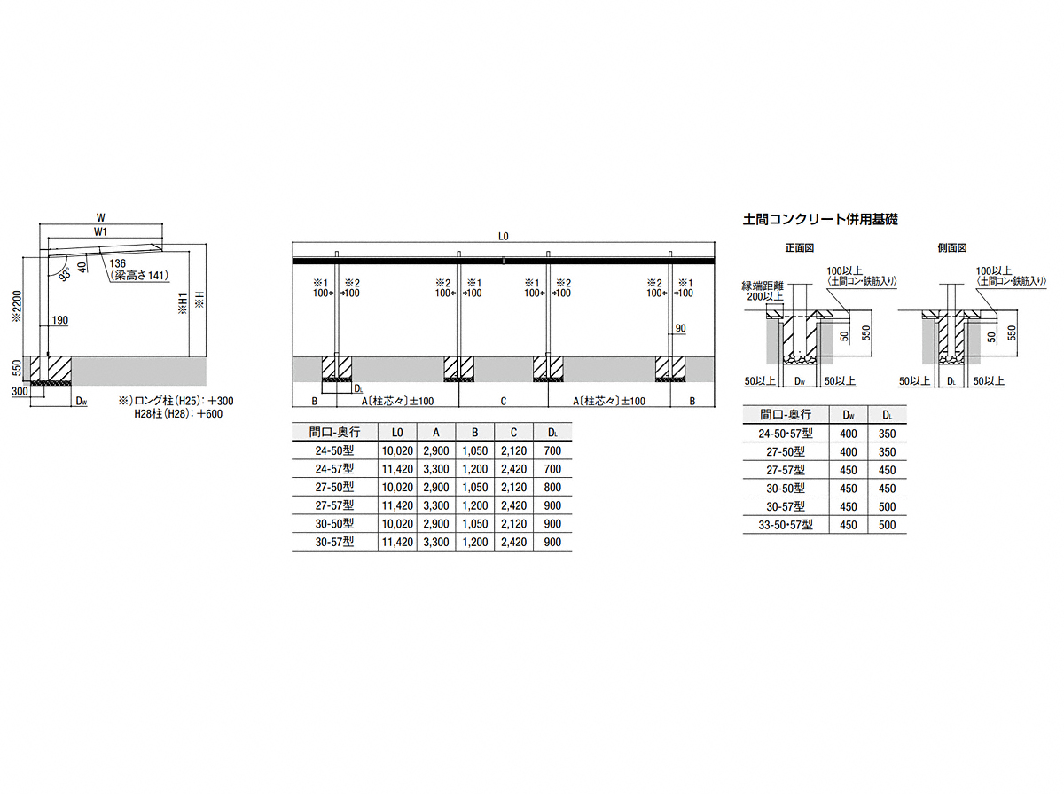 カーポートSC 1台用 縦2連棟 ダスクグレー色はアルミ素材の長方形型に伸びたルーフが特徴の縦2台駐車可能なカーポートです。強度抜群のアルミタイプの屋根材を採用し、その耐久性能は基準風速Vo=40m/s・耐積雪20cm相当を確保。