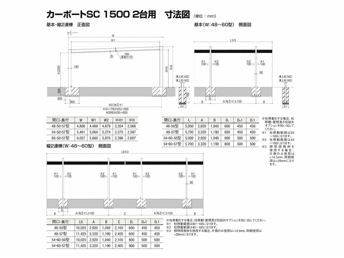| 屋根高タイプ | 標準柱仕様(有効高 約2,200mm) / ロング柱25仕様(有効高 約2,500mm) / ロング柱28仕様(有効高 約2,800mm) |