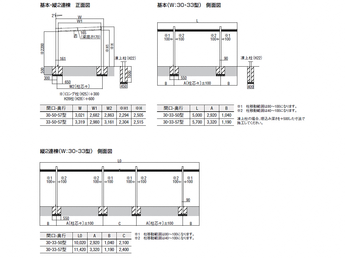 | 屋根高タイプ | 標準柱仕様(有効高 約2,200mm) / ロング柱25仕様(有効高 約2,500mm) / ロング柱28仕様(有効高 約2,800mm) |