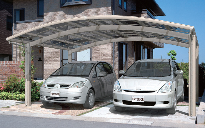 シンプルなカーポート、カムフィシリーズからカムフィL。こちらのM合掌タイプは2台用となっております。屋根パネルの素材にはポリカーボネート板とアルミポリエチレン複合板の2種類あり、アルミポリエチレン複合板は防火性が高く直射日光や紫外線を通しません。