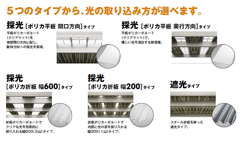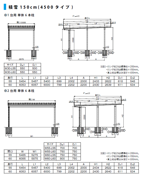 | 屋根高タイプ | 標準柱仕様(有効高 約2,300mm) / ロング柱25仕様(有効高 約2,500mm) / ロング柱30仕様(有効高 約3,000mm) / 凍上ロング柱25(有効高 約2,500mm) |