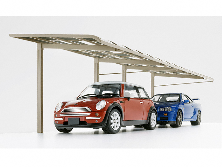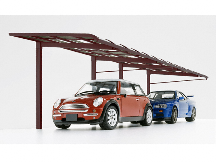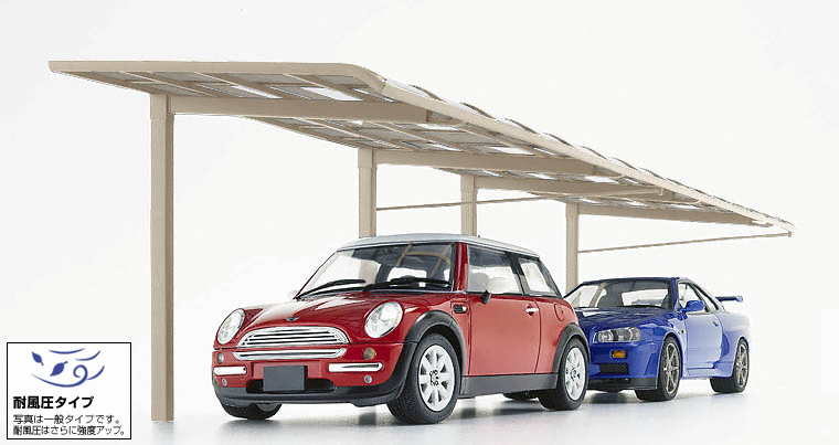 柱側が高く、屋根先が低くなっている「逆勾配」タイプです。隣家に雨の跳ね返りを防ぎたい方、縦列駐車地に設置する方にお勧めです。屋根下がすっきりした雨樋なしタイプとしっかりと集める雨樋ありタイプの2種類があります。「耐風圧強度使用」は通常タイプに着脱式サポート・補強部品がセットになって商品です。