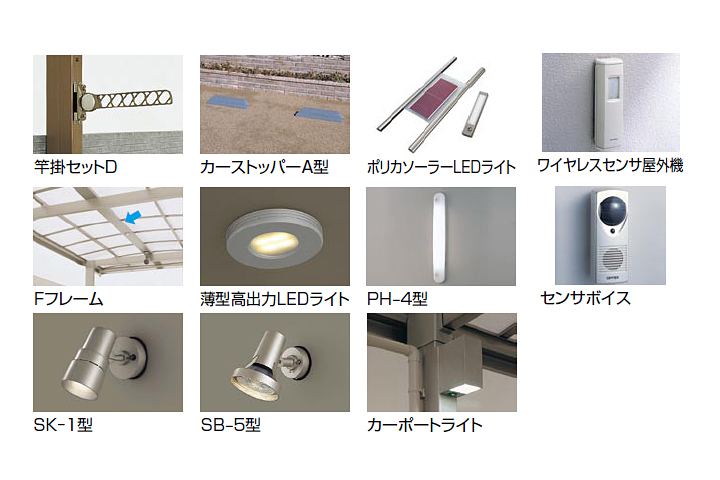 より屋根が多いかぶさった印象を与えまるで車を守る建物ように。木目調の飾りで個性的なカースペースを演出します。1台用のスペースプラスαで、快適空間が広がります。正面飾りの部分のパネルは白(不透明)のみとなります。