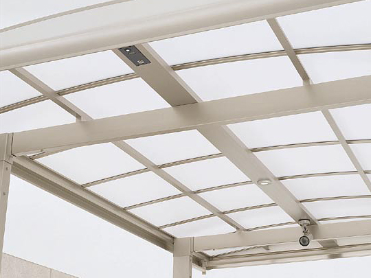 通常のカーポートに、母屋補強材・屋根材ホルダー・サポートSを4本取り付けて強度をグレードアップした仕様です。有効高が標準で約2200mmなので、撥ね上げ式のカーゲートと干渉しにくくほとんどの車種でも対応できる高さです。