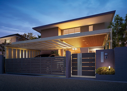 フラットで美しいルーフにより、新たなファザードスペースを提案。ガーデンフールで作る上質なカースペース。カースペースだけでなく、暮らしの中心のお庭にも設置が可能。屋根を選んで自分好みの仕様にカスタマイズできます。