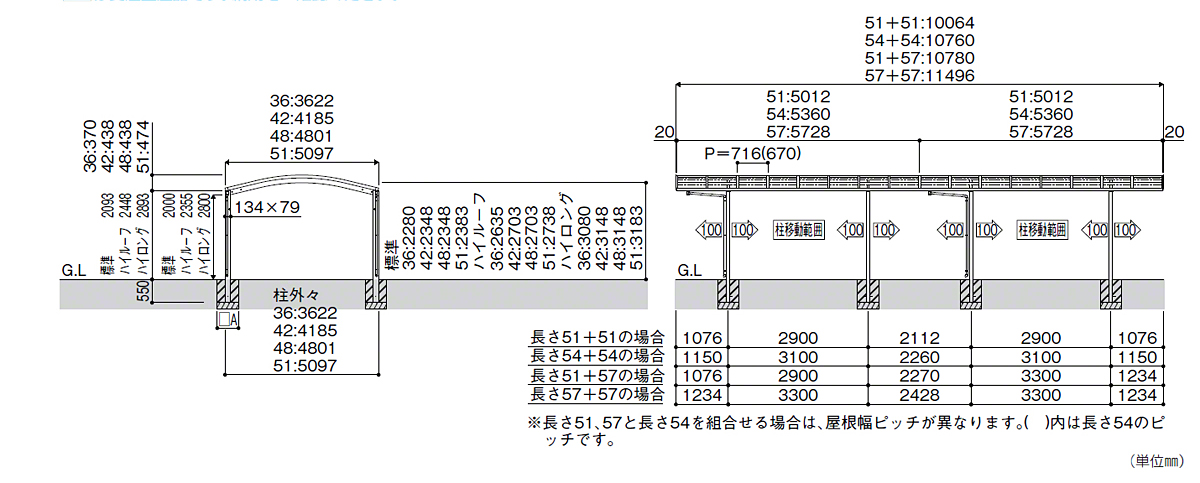 | 屋根高タイプ | 標準柱仕様(有効高 約2,000mm) / ハイルーフ柱仕様(有効高 約2,350mm) / ハイロング柱仕様(有効高 約2,800mm) |