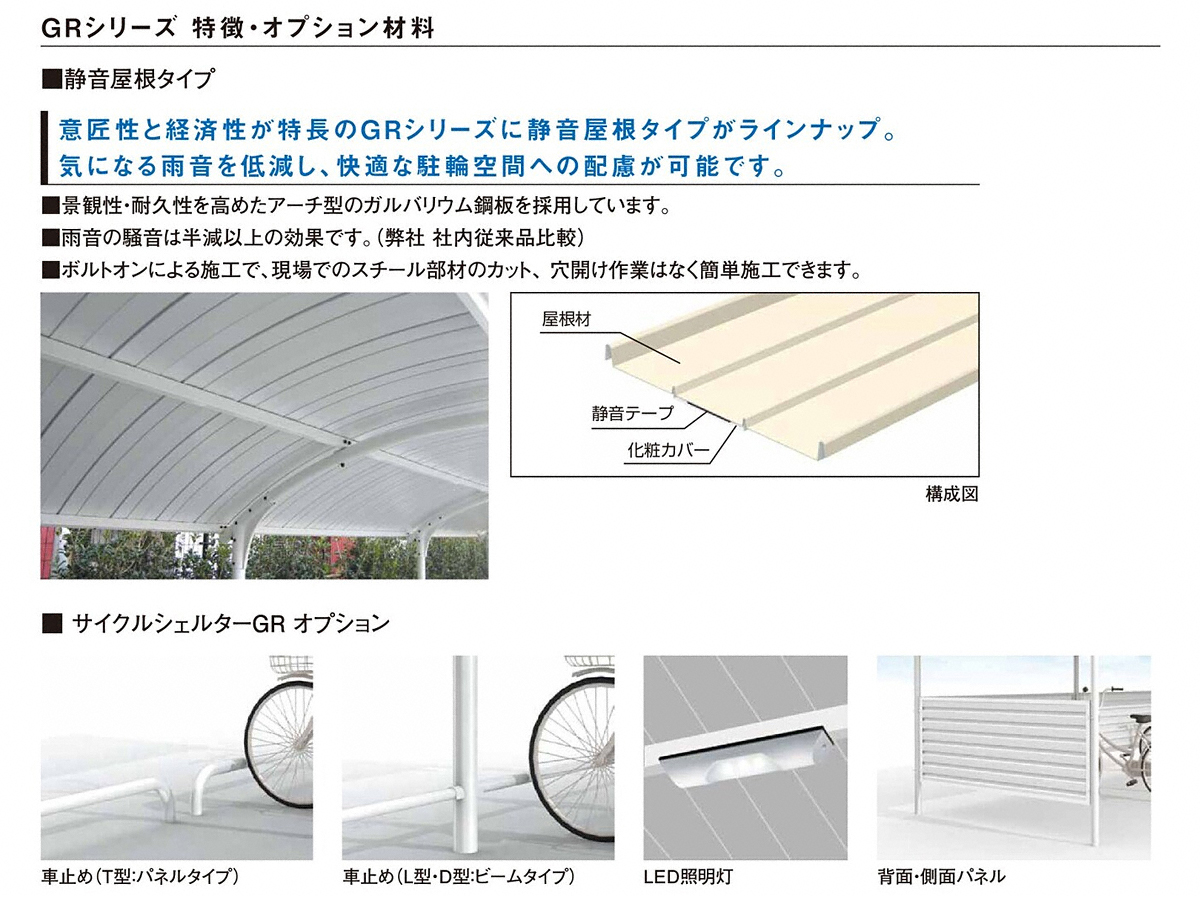 自転車置き場 サイクルシェルターGRシリーズ LGR 2連棟は屋根に深めのアールがかかったL型支柱スタイルのサイクルポートです。支柱が一方側のみの構造でフリースペースが多めです。設計風速は34m/s、耐雪荷重は900N/u(積雪量45cm)となっています。