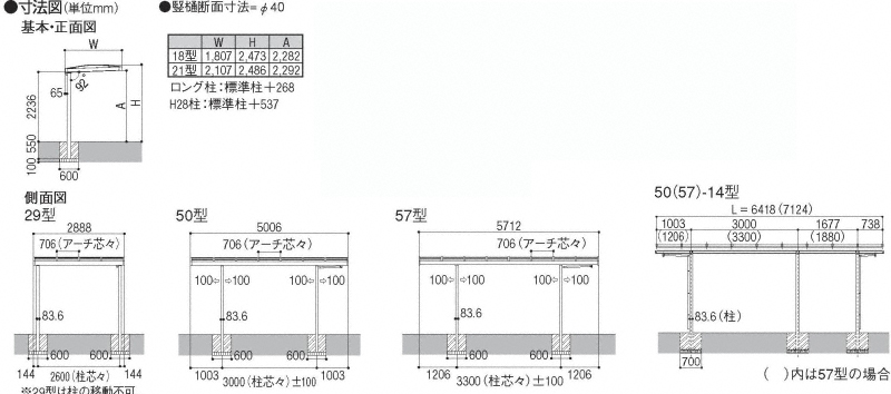 屋根高タイプ | 標準柱仕様 / ロング柱25仕様 |